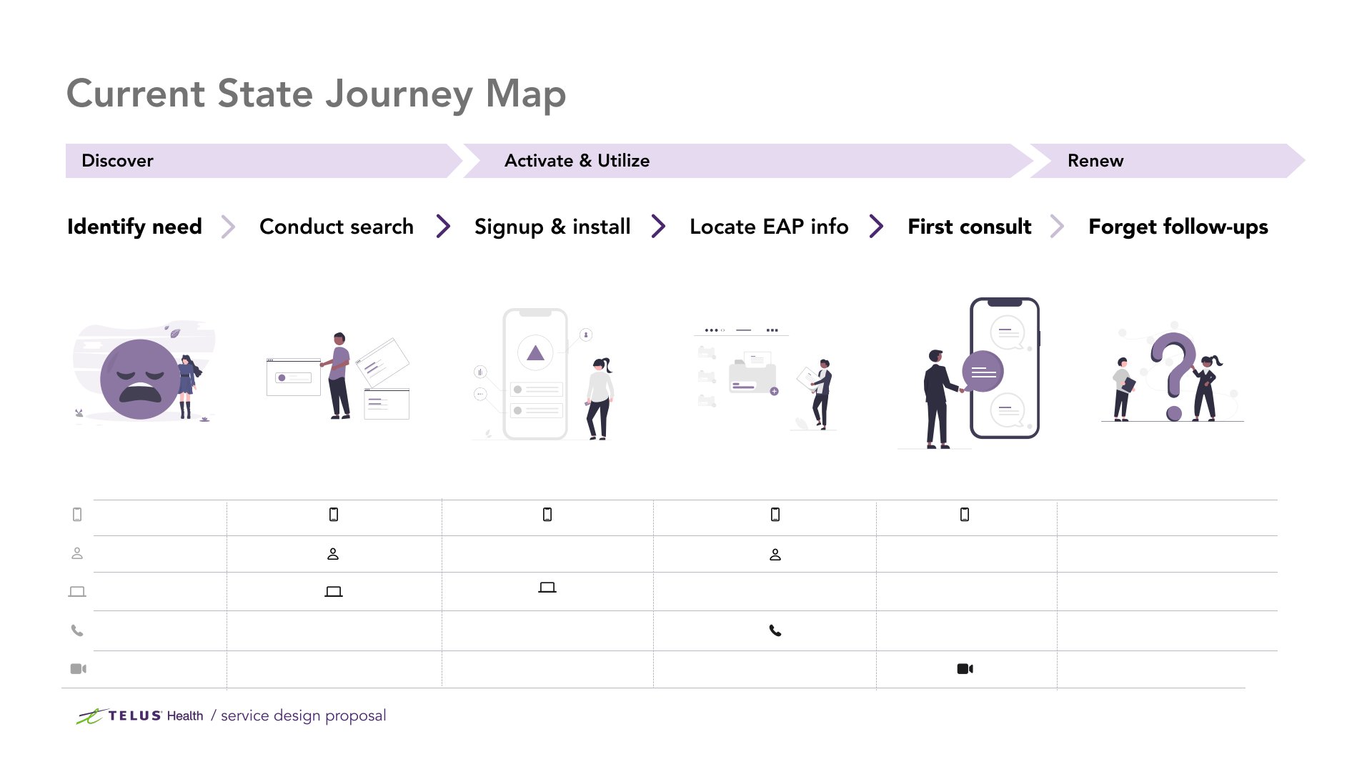 To further visualize and brainstorm how to better understand user needs, our team created a ‘current state’ journey map to show key touchpoints for our users.