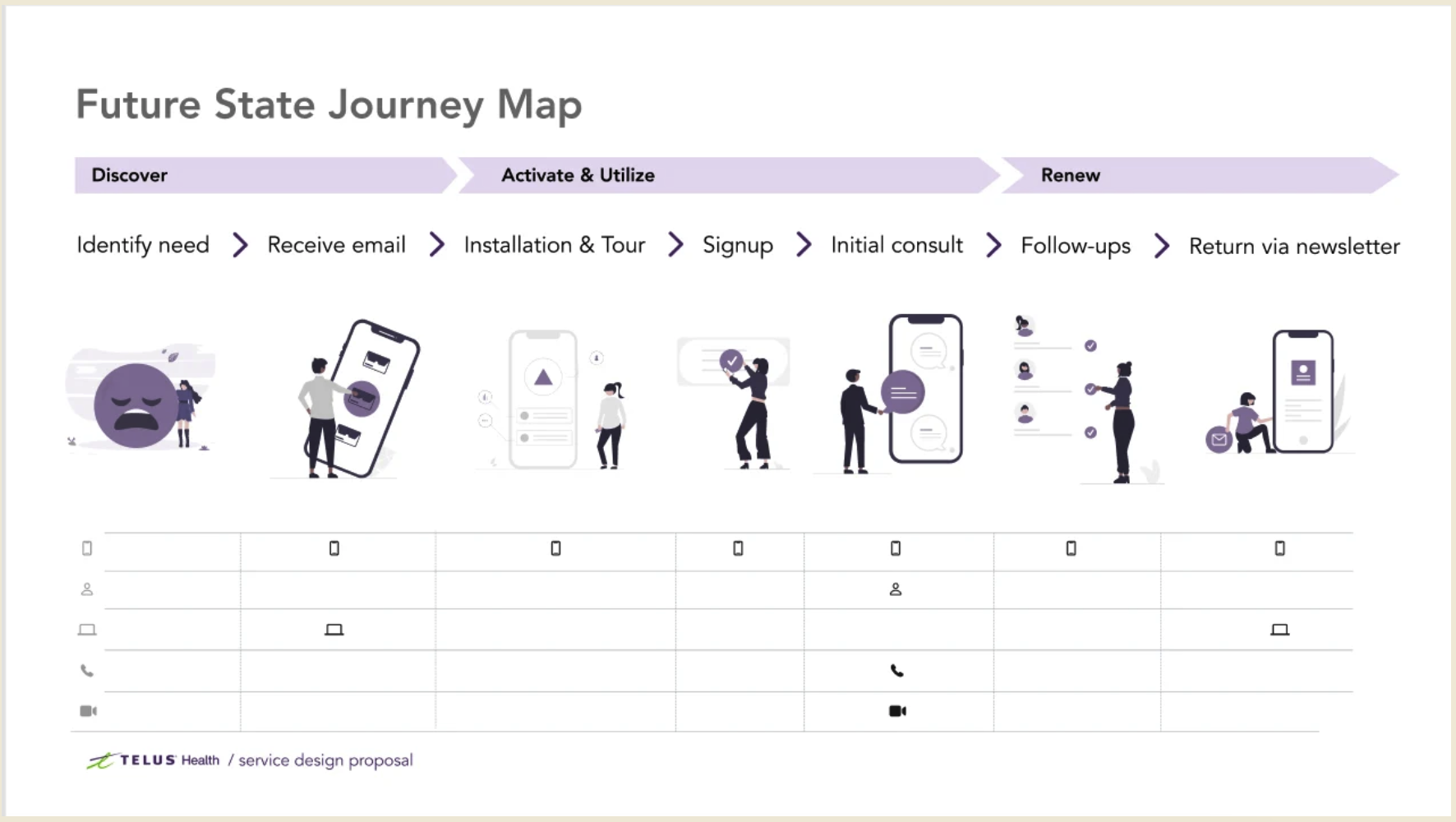 Based on the mid-fi prototype and the new features and touchpoints this included, our team created a 'future state' journey map to highlight to stakeholders how user needs will be better aligned with these functions.